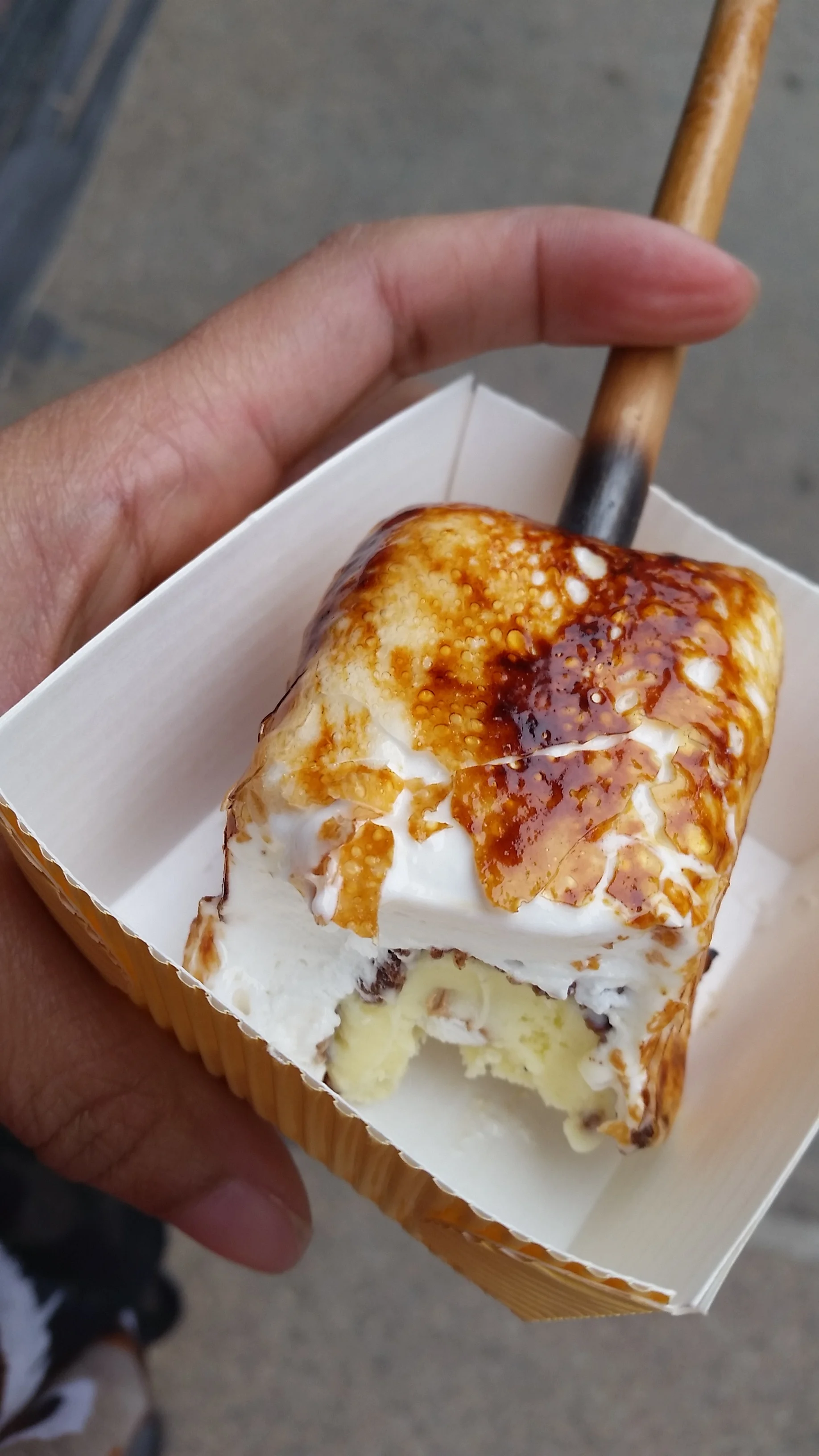I could not let my exploration go to waist, so when I saw frozen s'more on the menu I was intrigued as to how this was suppose to happen. A frozen s'more? I was really wracking my brain as to how this was possible while I waited. The marshmallow block was nicely bruleed on the outside. I took a bite to find a nice creamy custard surrounded coated with a chocolate shell and enclosed by the bruleed marshmallow. This blew my mind...a frozen s'more! This was worth it! If you are ever in New Your City make your way over to Soho to taste of of the sweet treats at Dominique Ansel's Bakery.